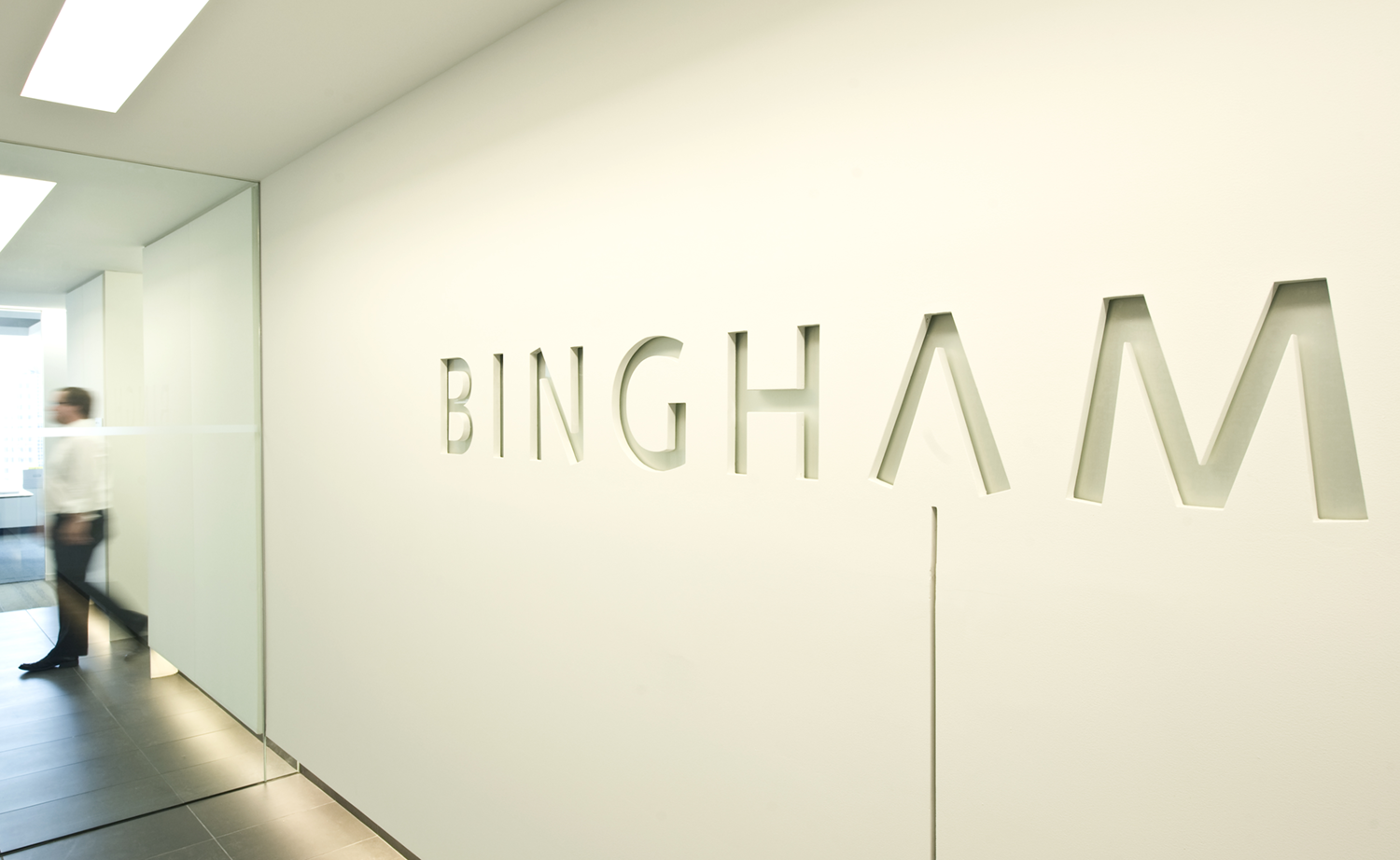 In 2008, Bingham underwent a renovation and rebranding of their law firm’s HQ in Boston and offices nationwide. Environmental graphics and signage were developed in coordination with the interiors to create a fully integrated brand experience across all offices.